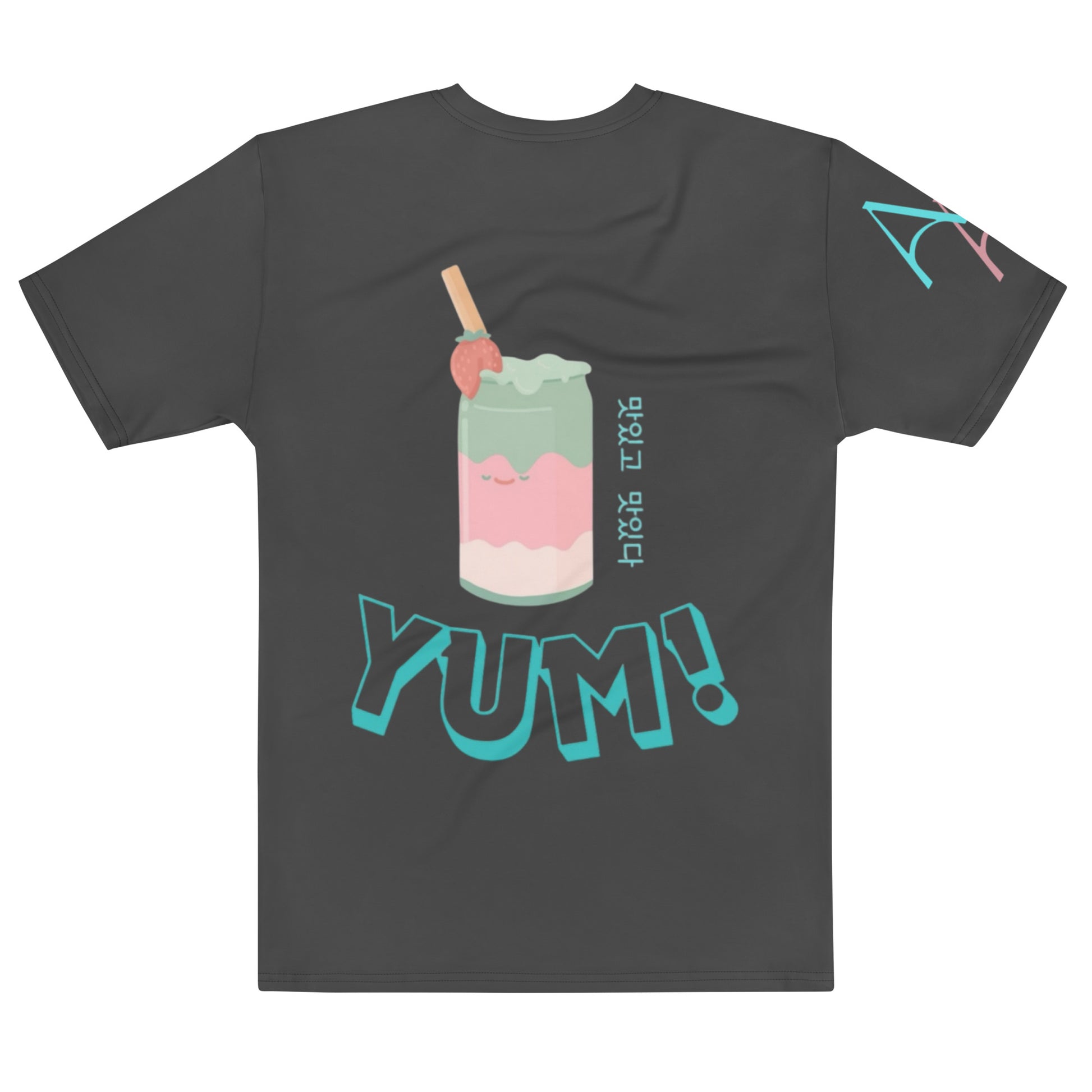 A t-shirt with a print just hits different—especially when it’s as bold as this one! The Yum Korean Drink T-shirt in black features a “Yum” logo in Korean letters on the front upper left (heart area) and a striking Korean drink graphic on the back with pink at the bottom and green at the top. The side showcases “Yum Yum” in Korean vertically, finished with bold blue “YUM” text beneath for that standout detail.
